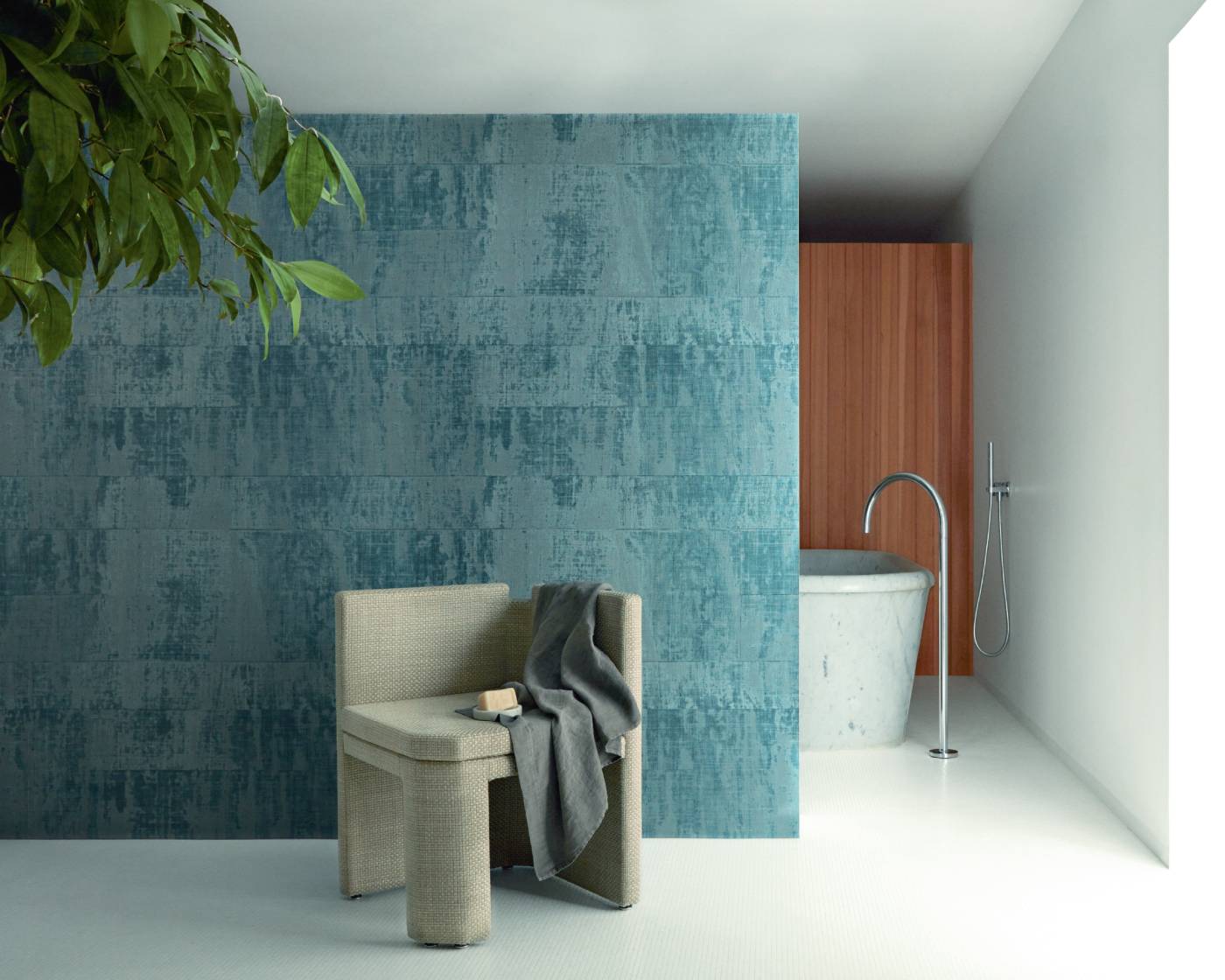 Geprägte Vinyltapete in der Optik eines Raffiagewebes.