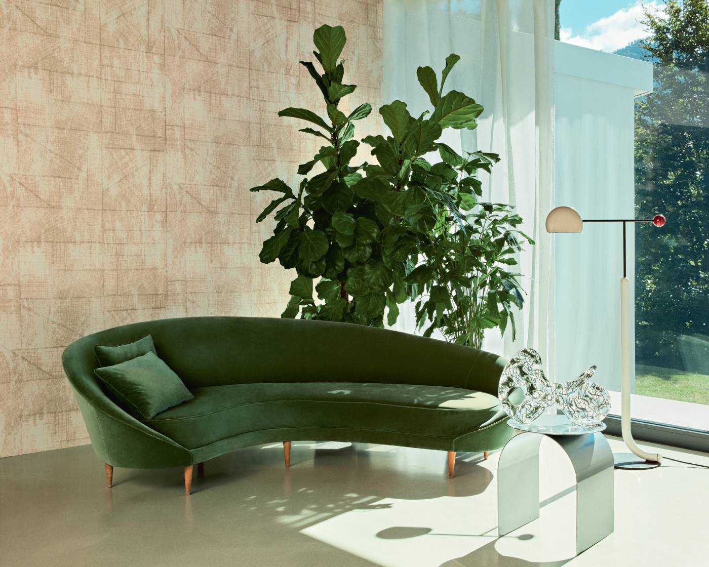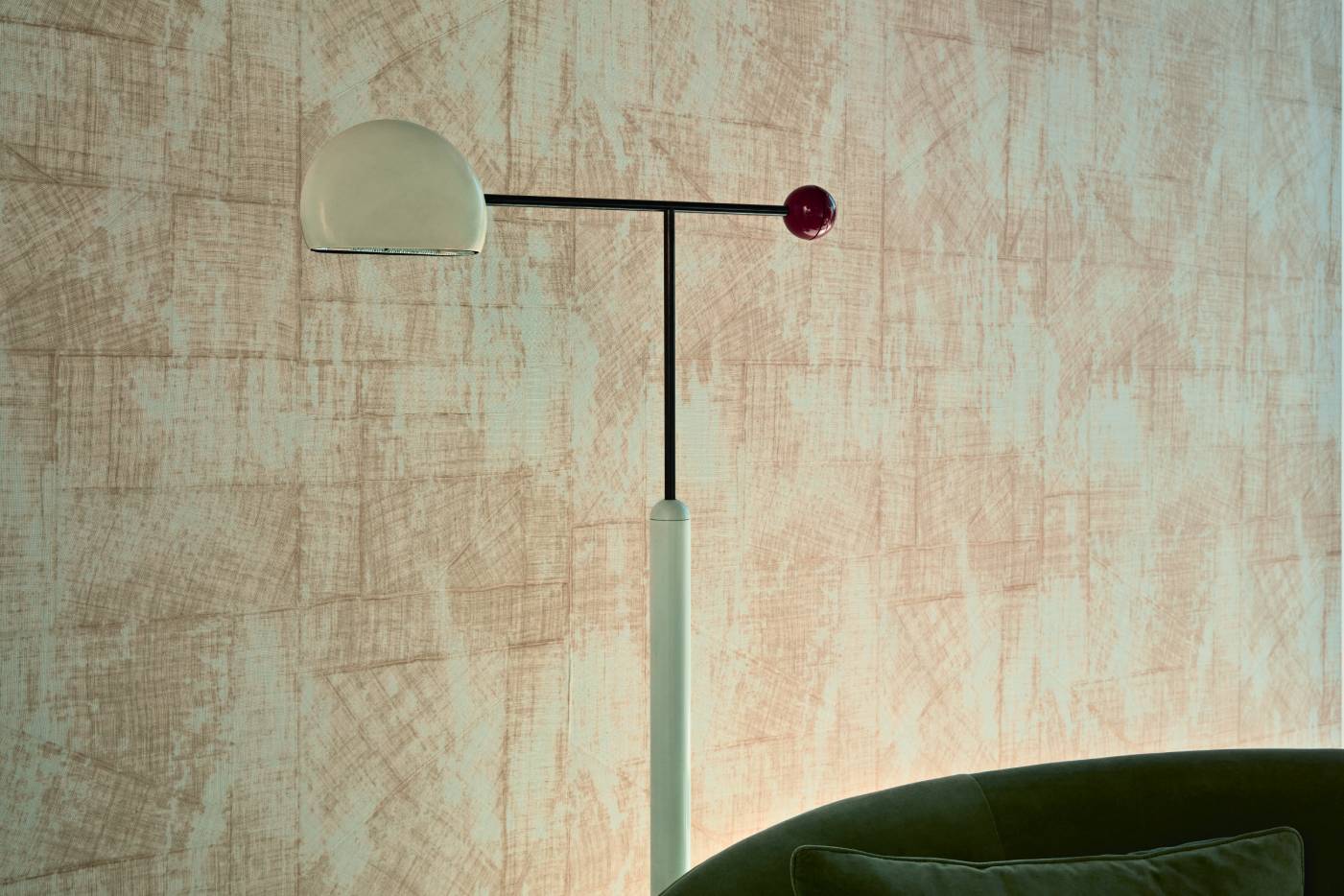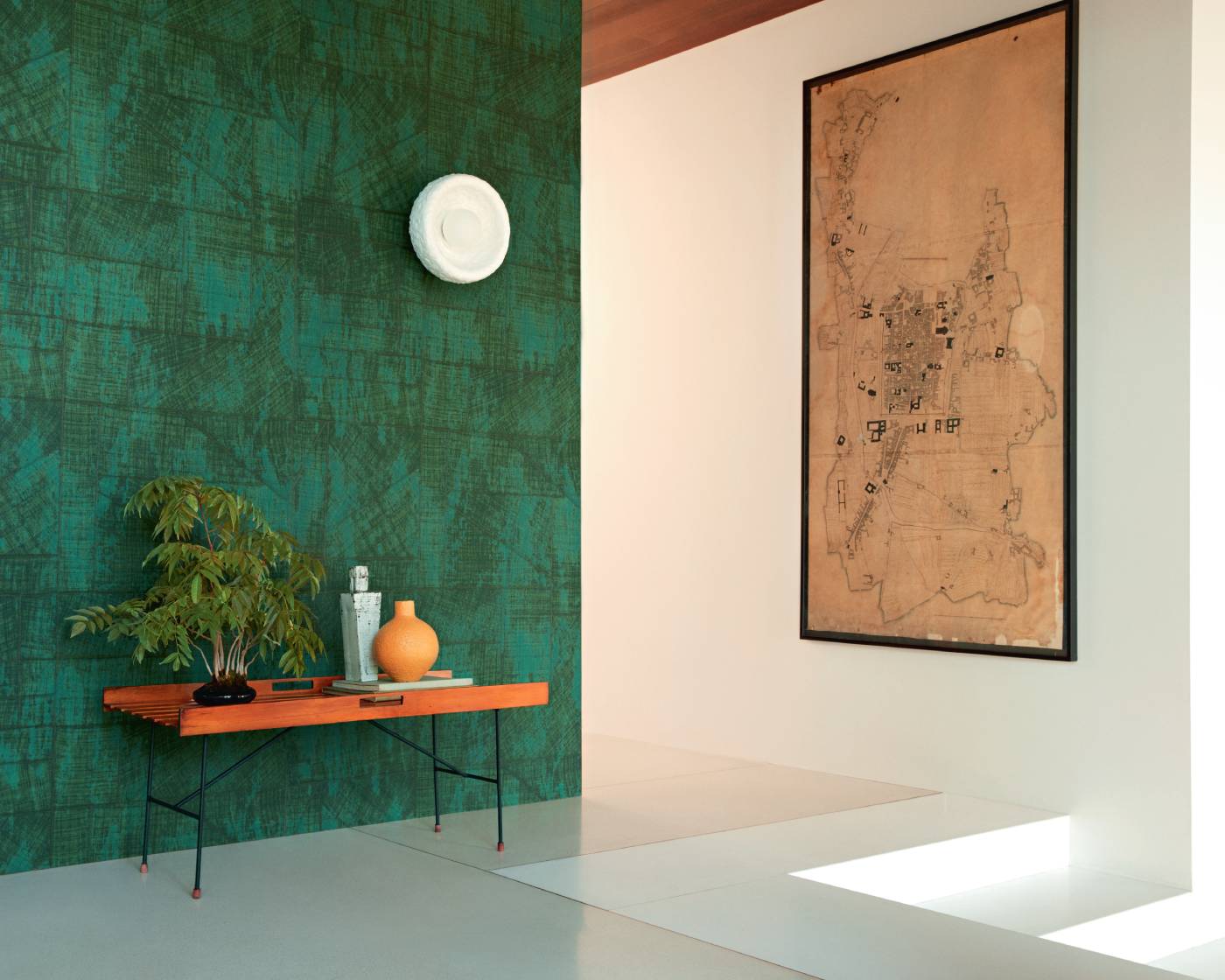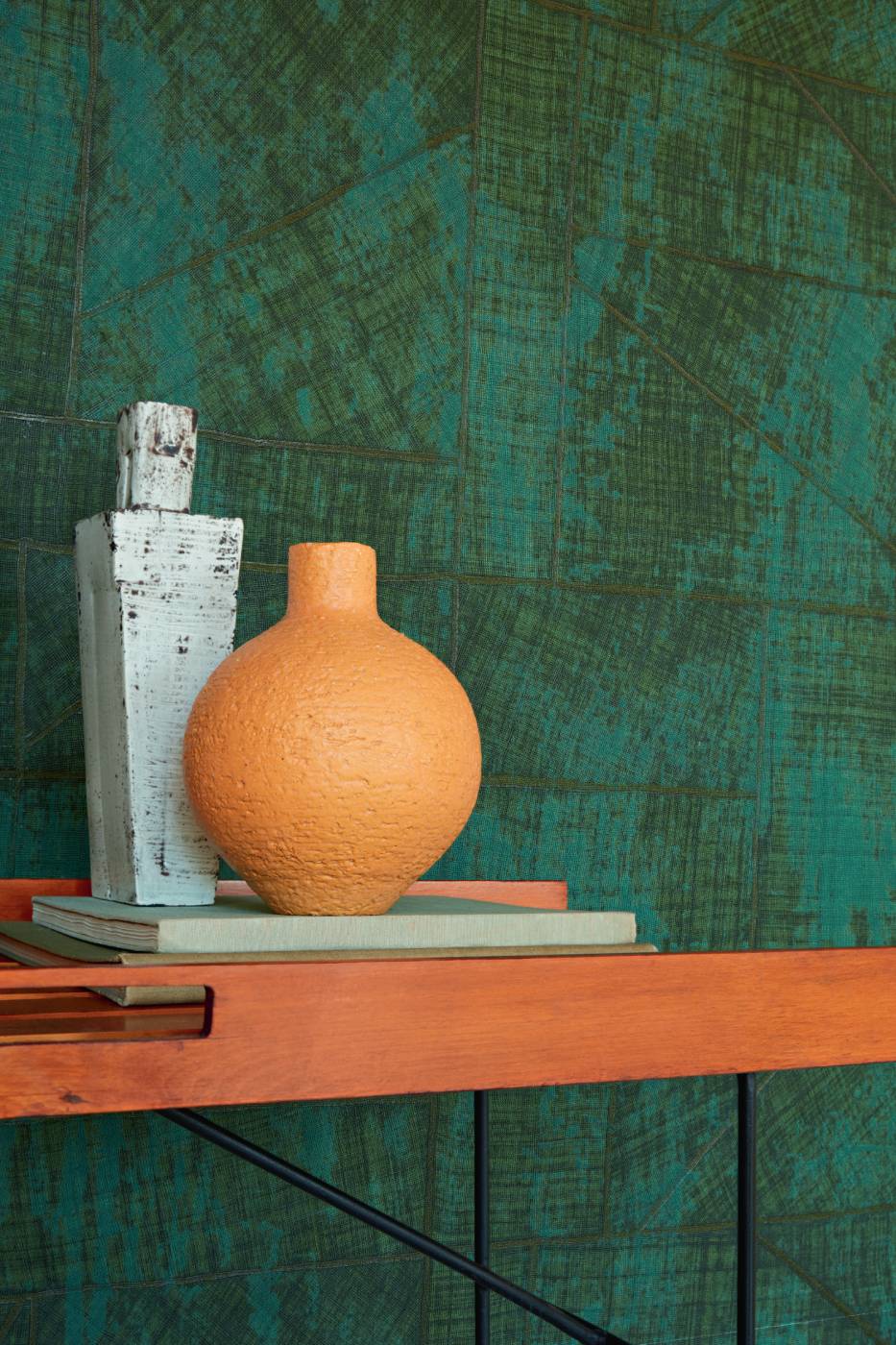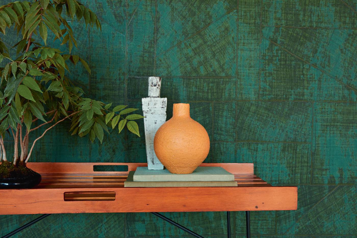 Geprägte Vinyltapete in der Optik eines Raffiagewebes.