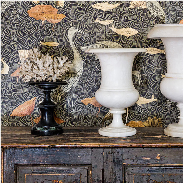Die Helden der Fototapete Enchanted River sind stilisierte Reiher, die sich in einem Teich bewegen, dessen Wellen durch Kurven im japanischen Stil symbolisiert werden.