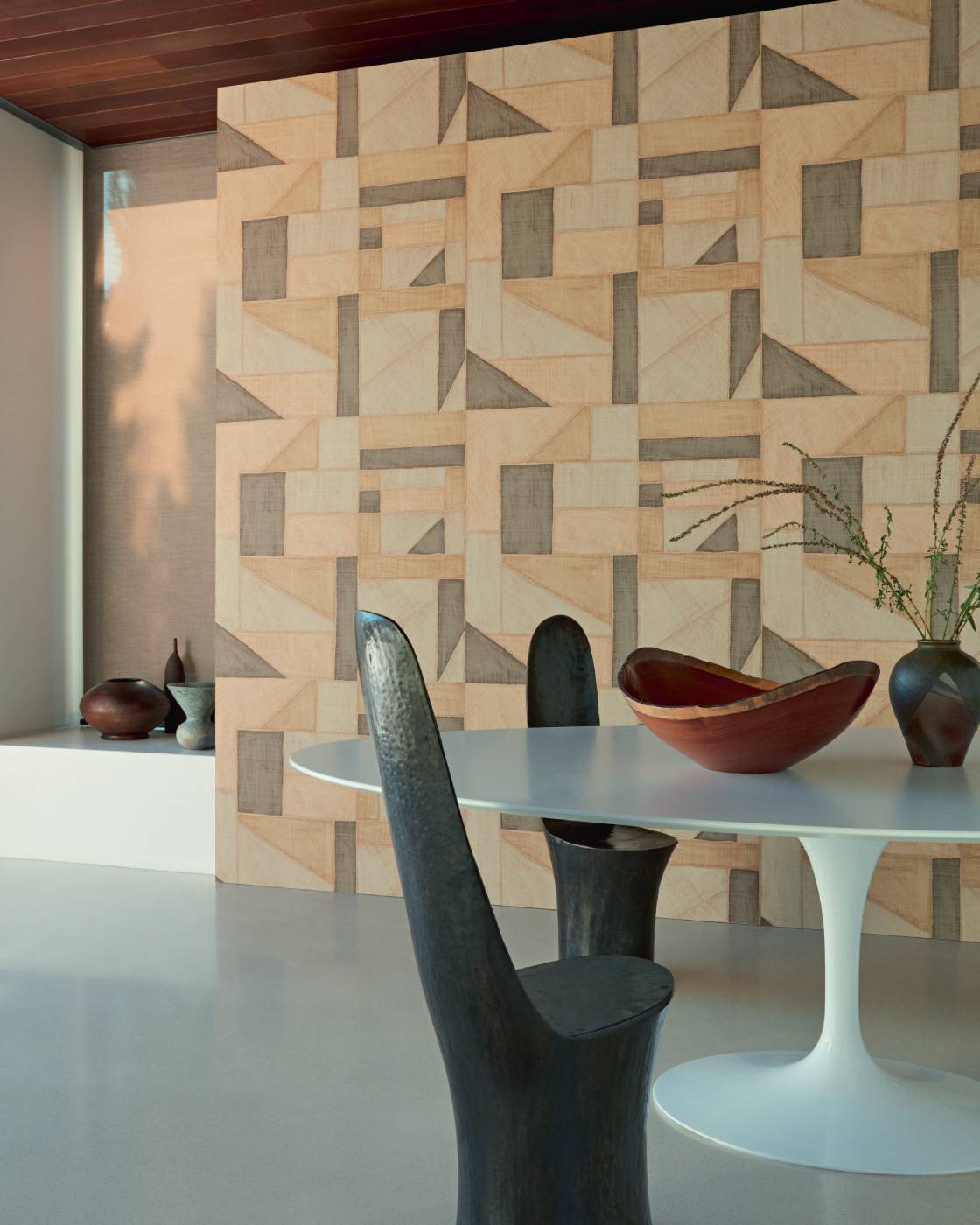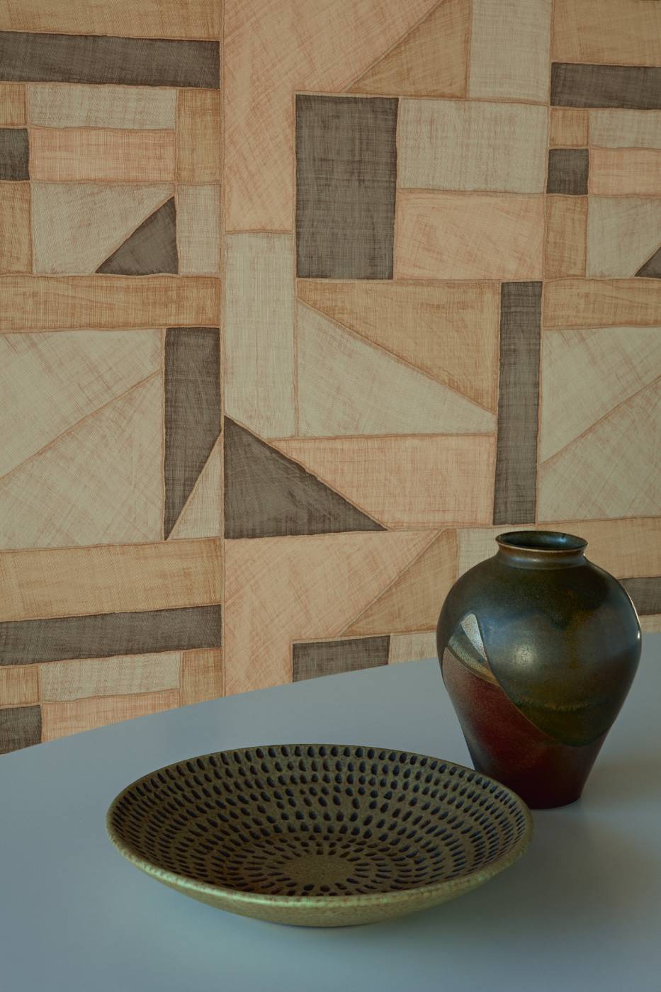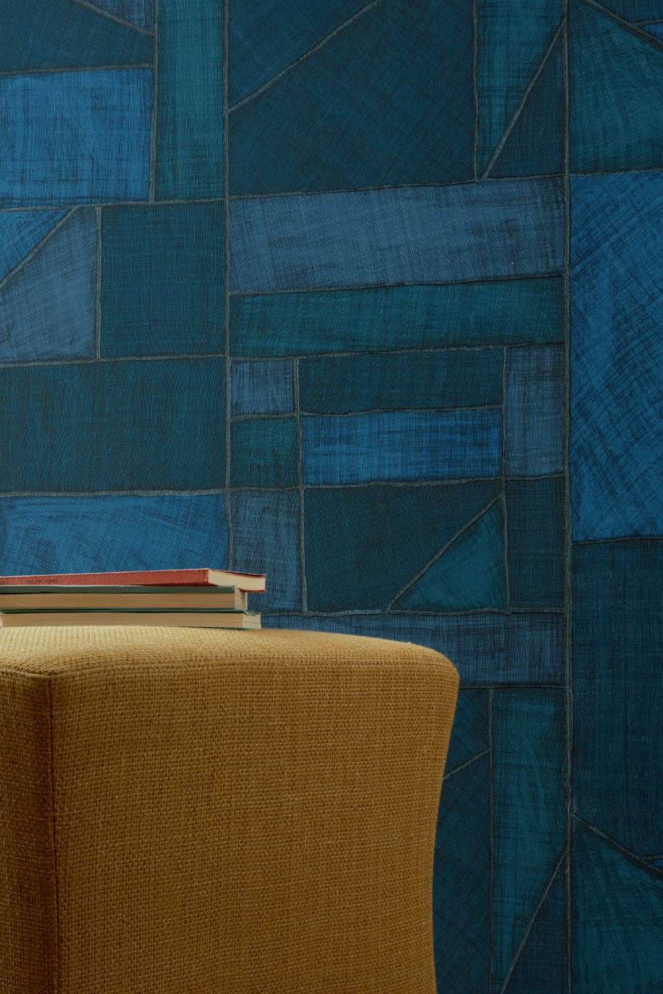 Geprägte Vinyltapete in der Optik eines Raffiagewebes.