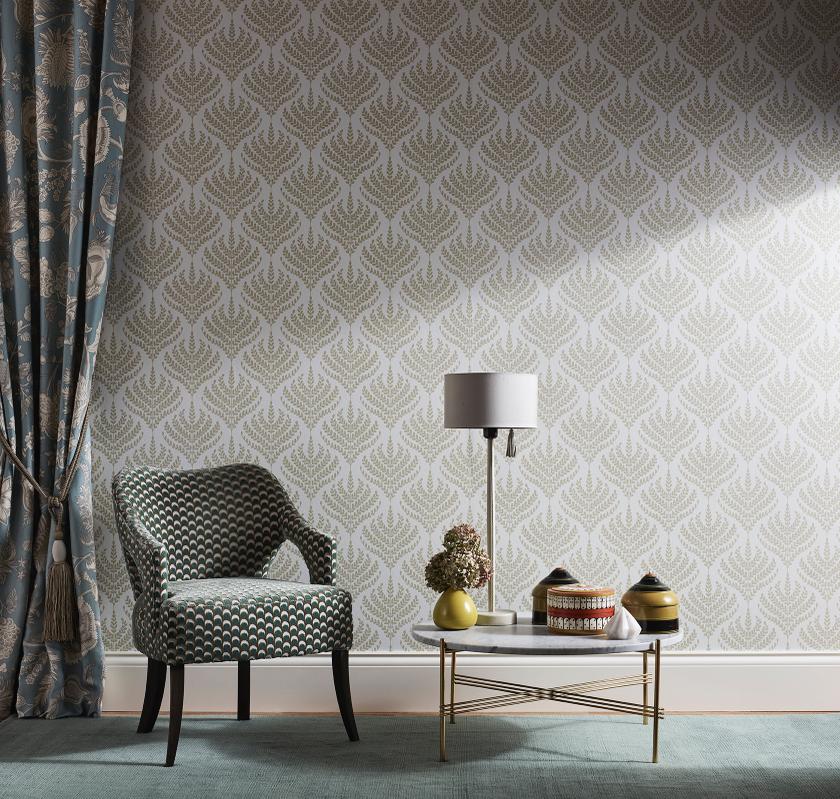 Das Team ließ sich von der gewagten Farbgebung mit beißenden Farbstoffen und natürlichen Pigmenten inspirieren. Gedruckt auf einem irisierenden Vlieshintergrund für Tapeten und auf vollflächigem Leinen für Stoffe, erstrahlt Palampore Trail in reichen Nuancen, die an diese exquisiten Färbungen von Pflanzen und Insekten erinnern.