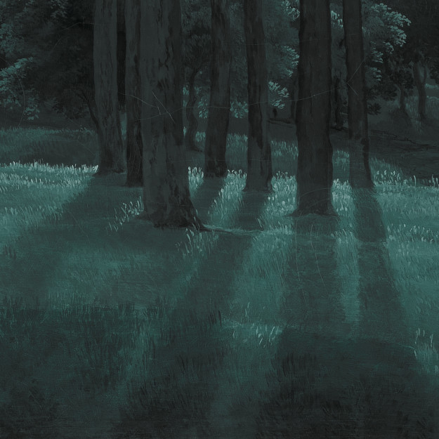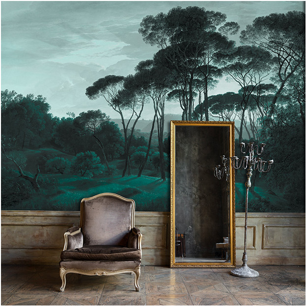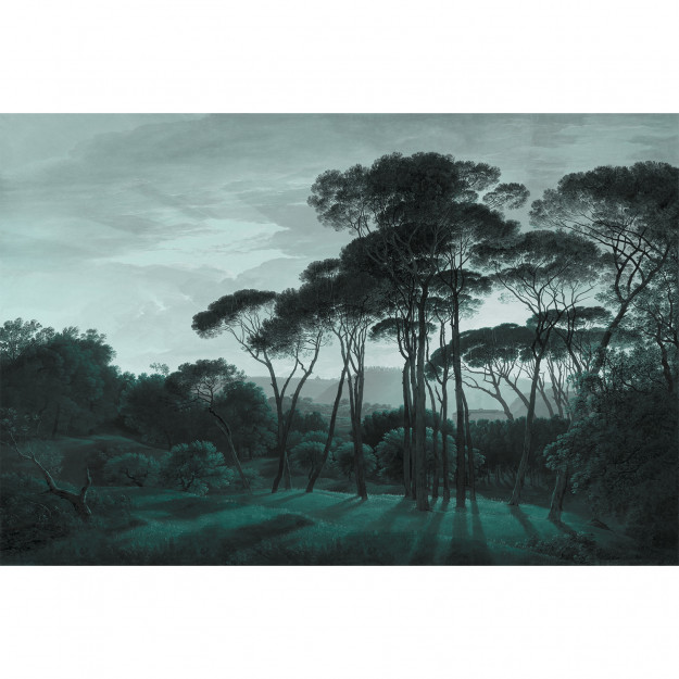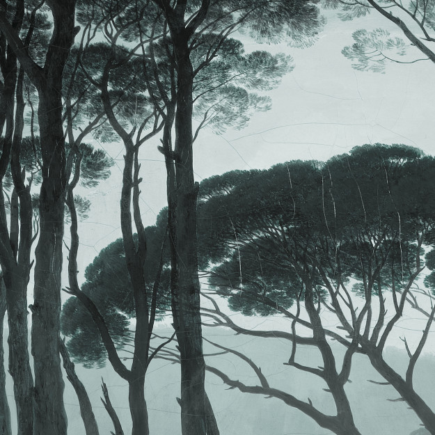 Pine Trees, Grüne Vlies-Panorama-Tapete mit Schirmpinien in einem mediterranen Garten.