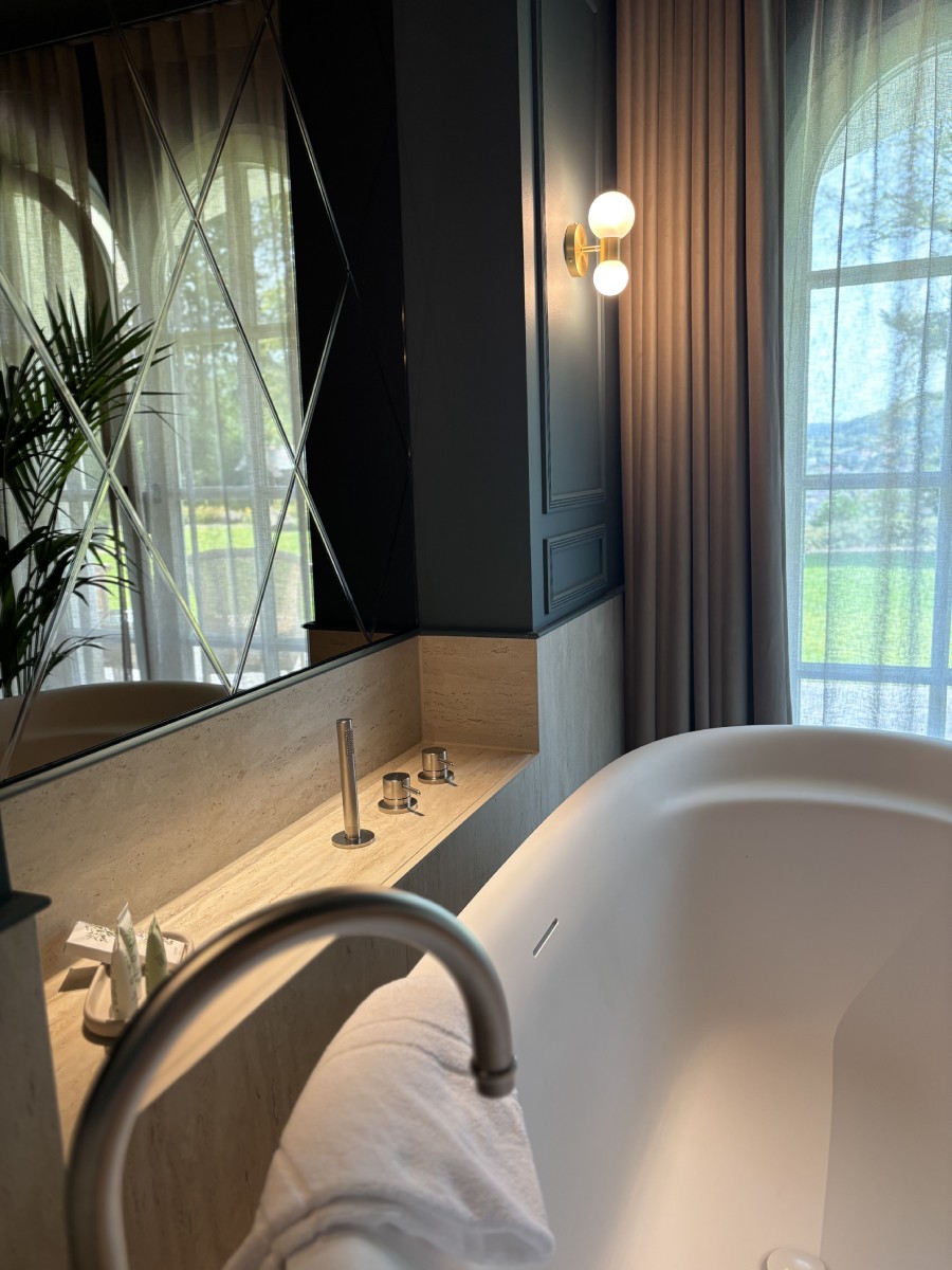 Das Wohnzimmer, in dem eine freistehende Badewanne steht, ist das Ergebnis langwieriger Designarbeiten. Facettierte Rauten-Spiegel reflektieren ein herrliches Panorama und sorgen für eine einzigartige und sehr gemütliche Einrichtung.