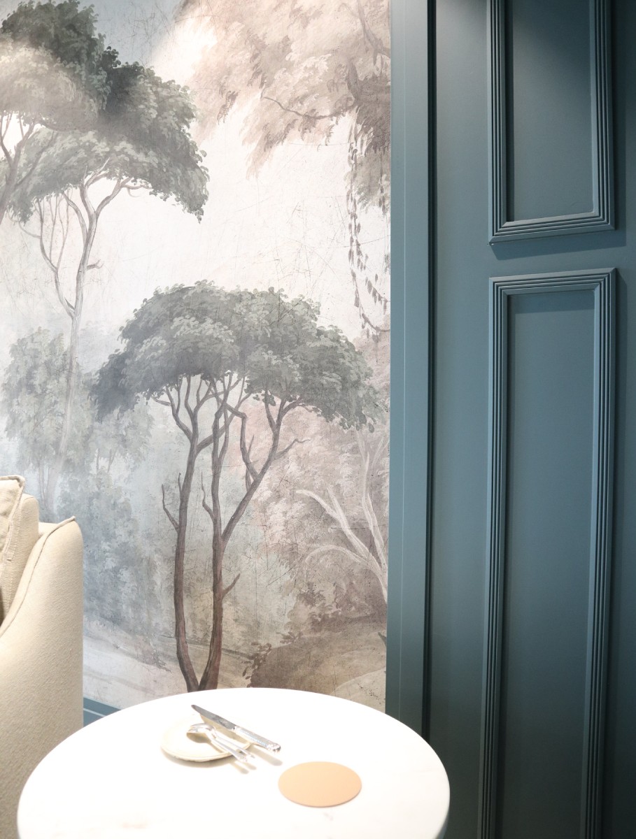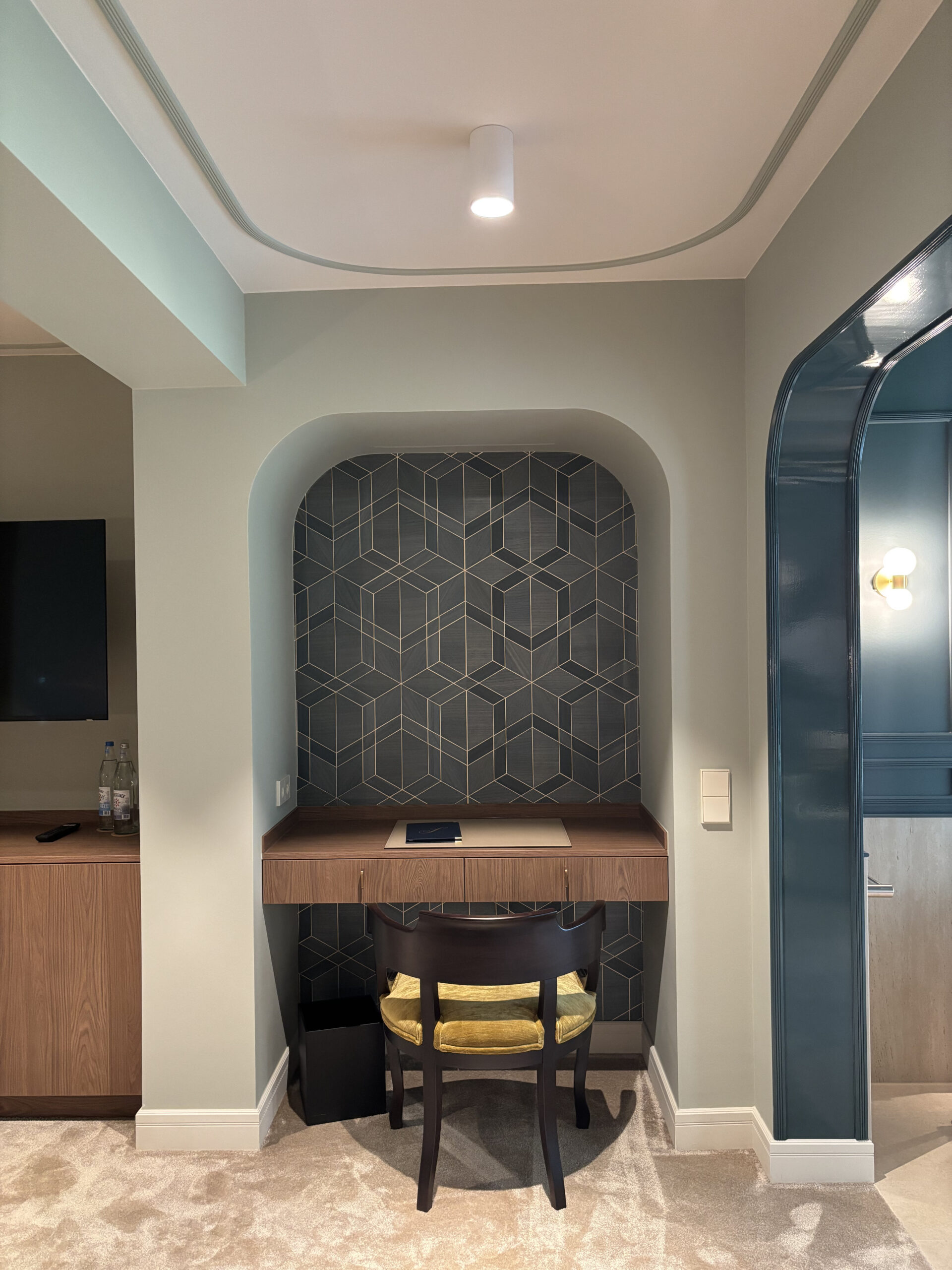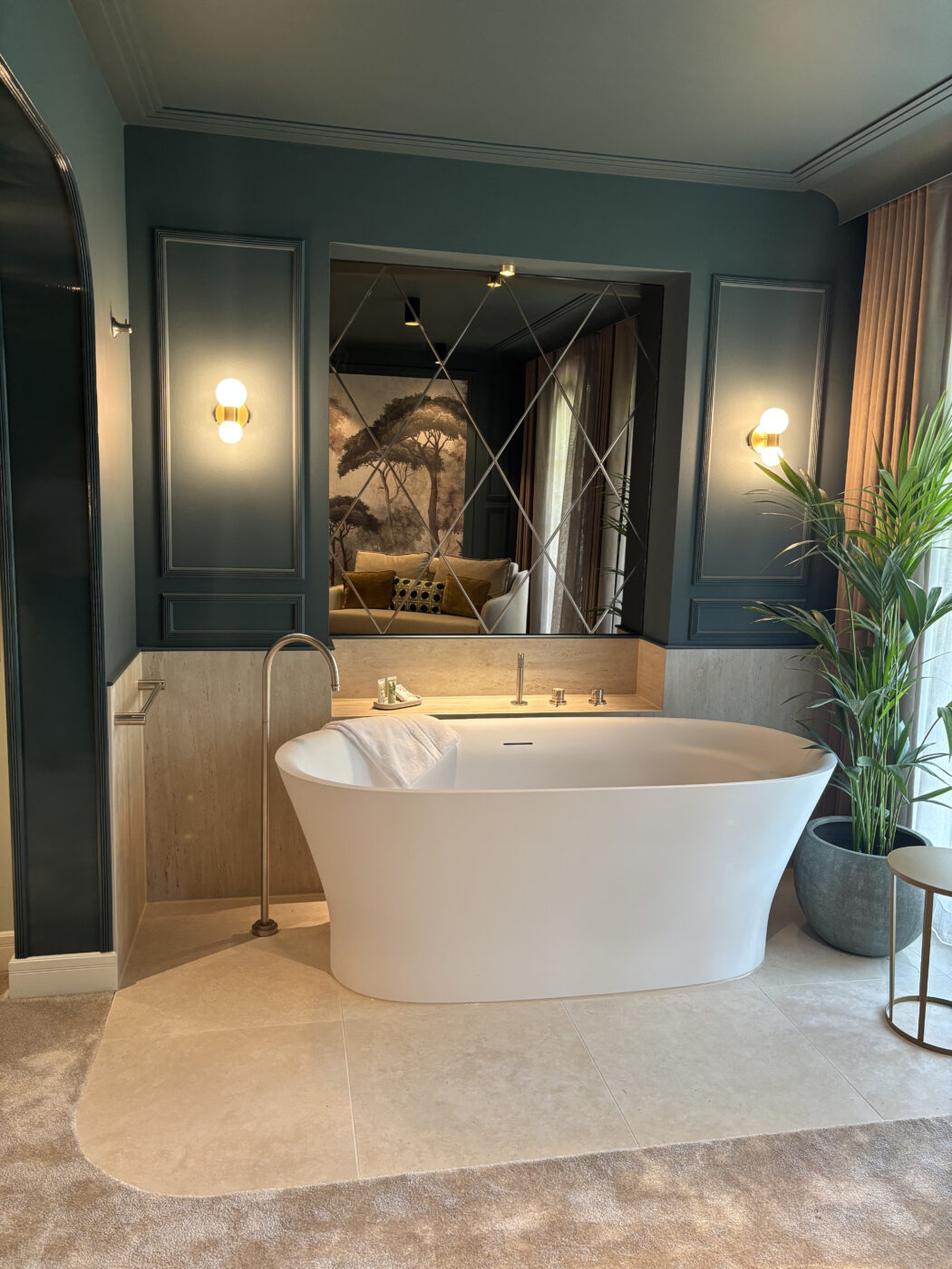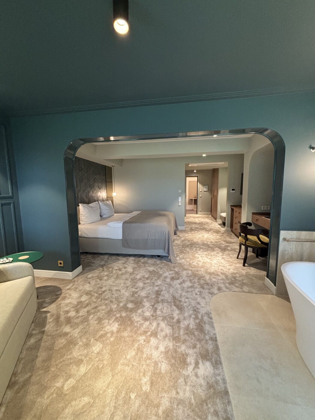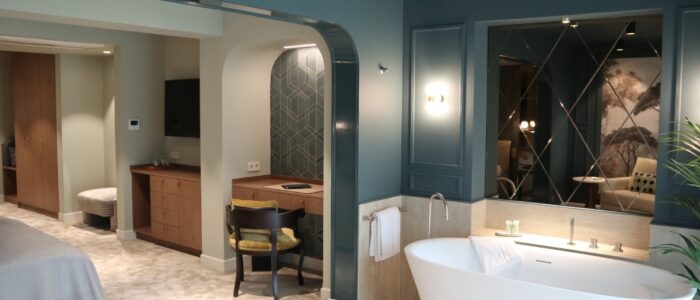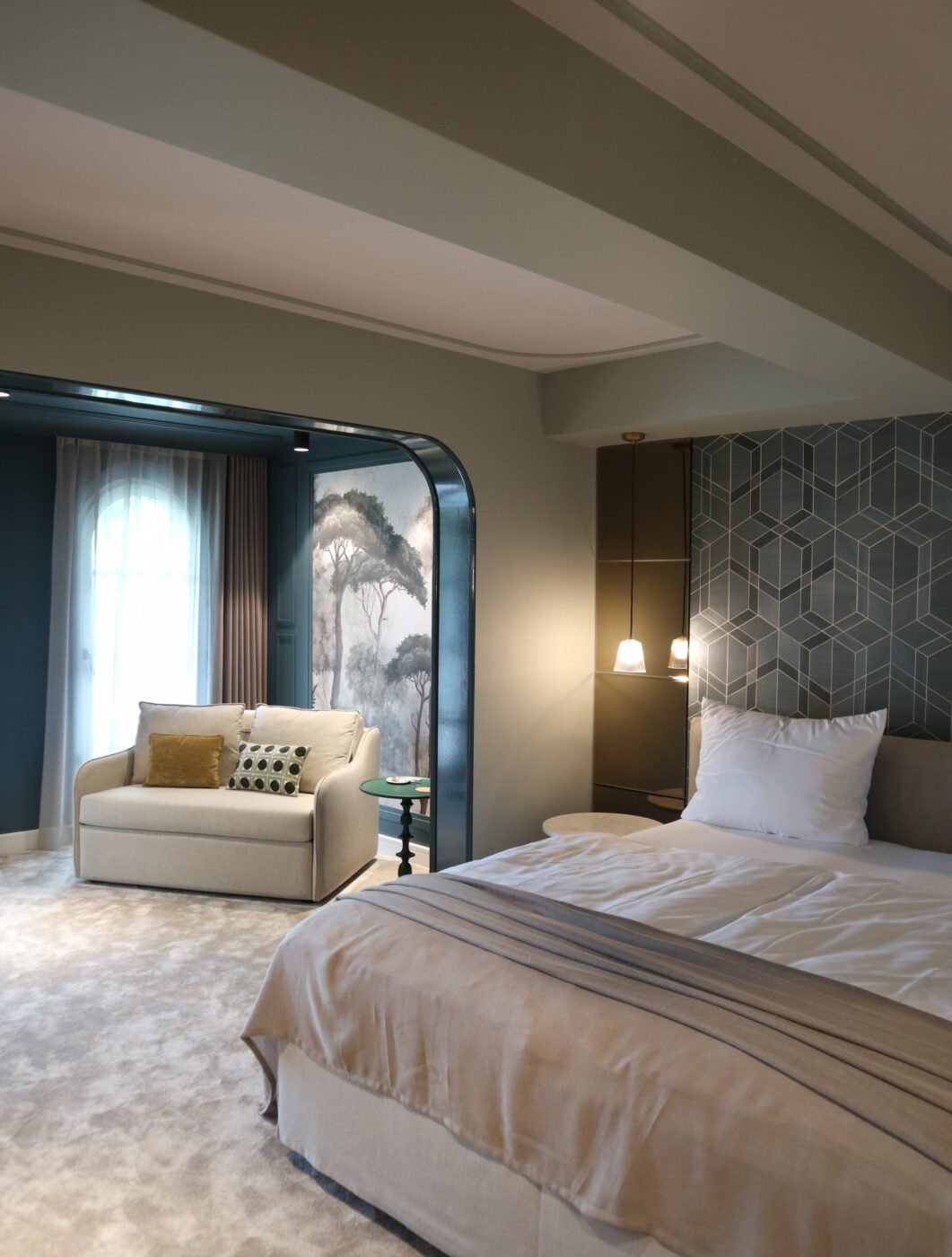 Die kleinere, aber ebenso bedeutende Suite Jardin mit einer Fläche von etwa 40 m² überrascht durch ihre farbenfrohe Auswahl an verschiedenen Grüntönen und Wandverkleidungen aus buntem Holzintarsien.