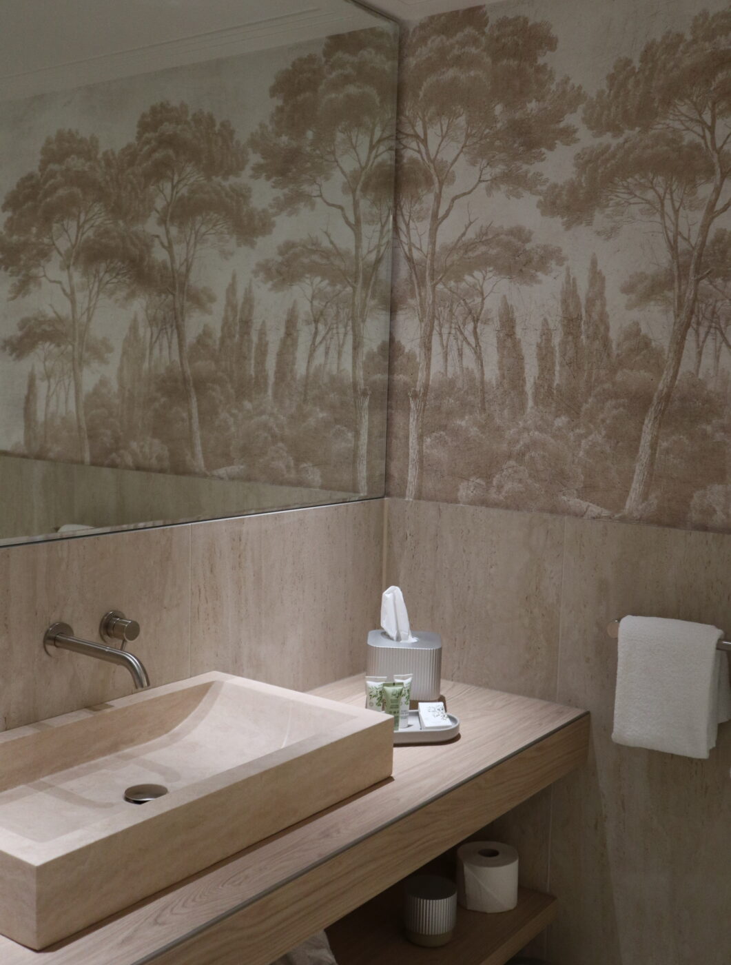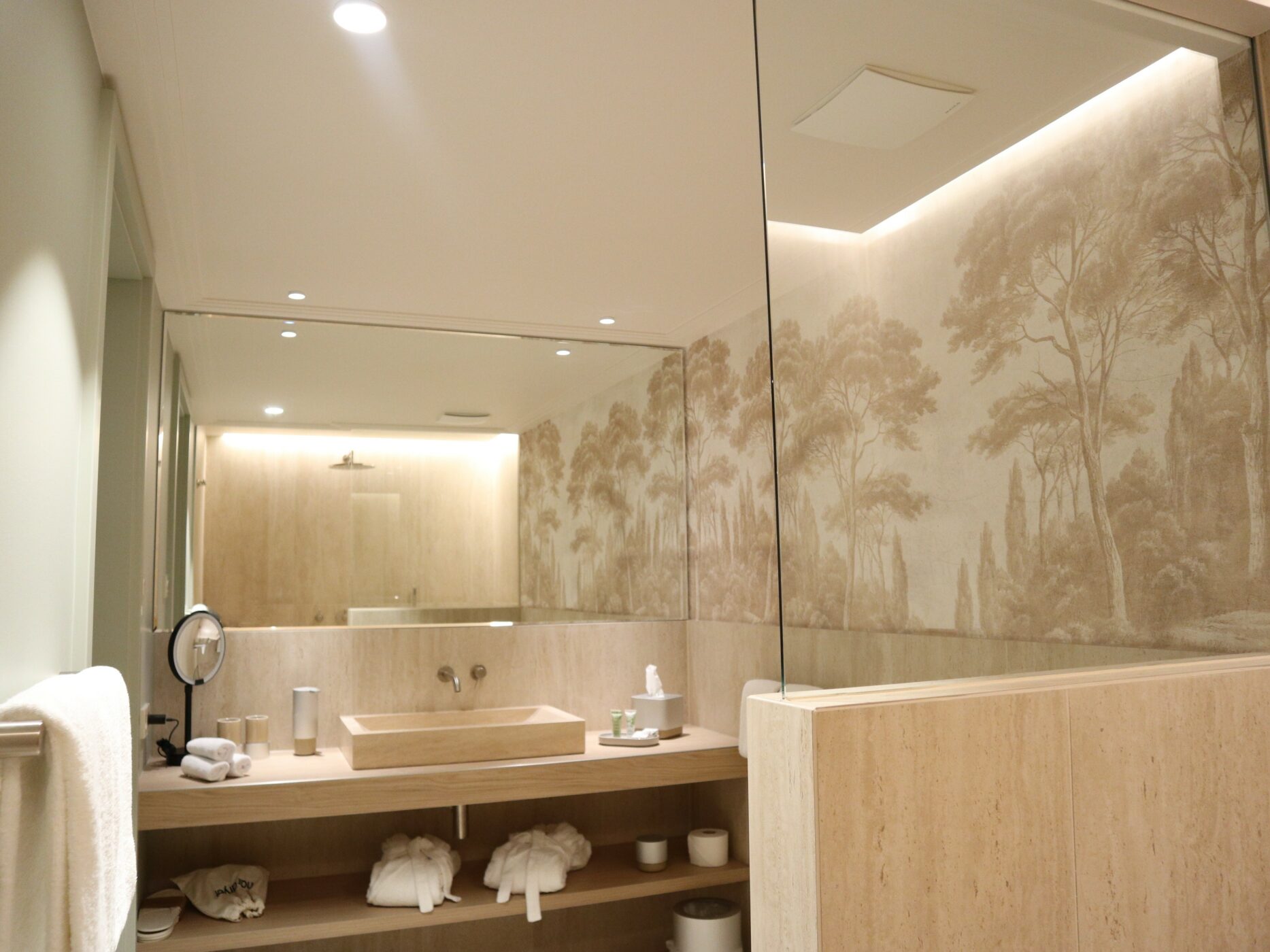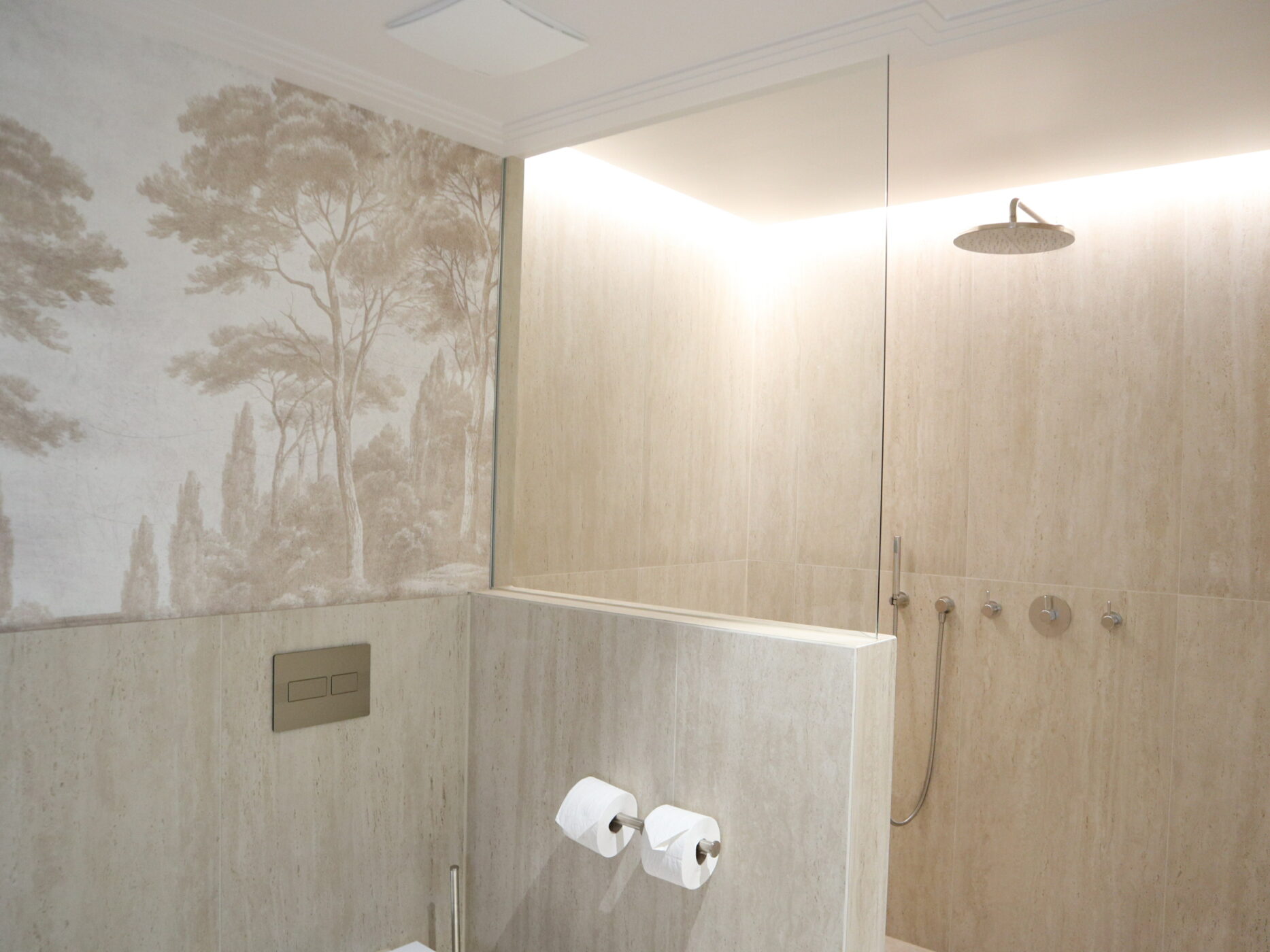 Das separate Badezimmer in hellen Farbtönen, mit der Eleganz von Travertin, verbunden mit einer romantischen Landschaft aus Zypressen und Pinien, deren majestätische Schönheit Sie auf eine Reise entführt.