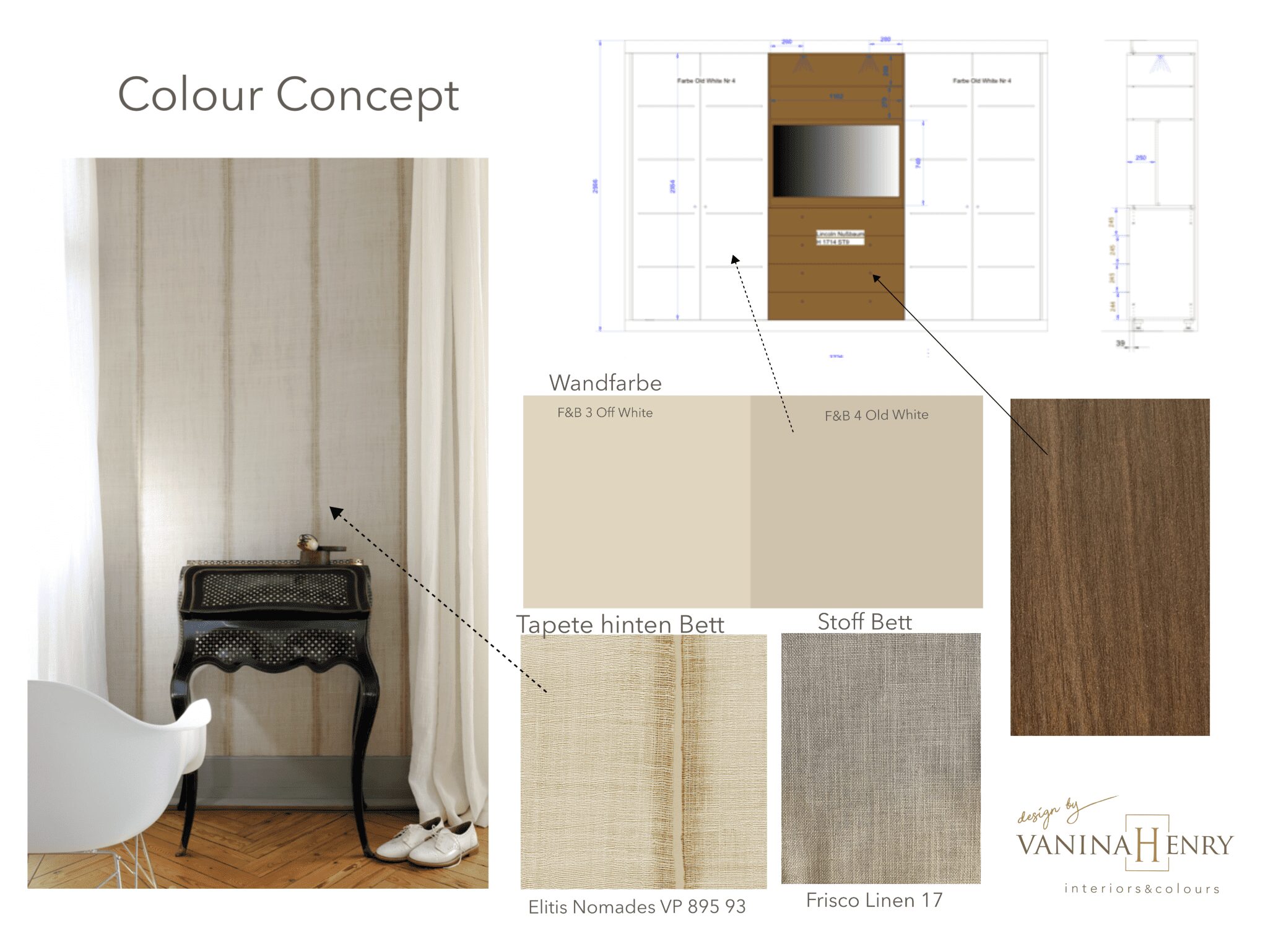 The wallpaper will be placed behind the bed and the tone of its linen fabric will match it perfectly, so that the eyes and the soul remain relaxed. We have carefully chosen the colour of the wood in the custom-made wardrobe to match the rest of the woodwork, which has been lacquered with Farrow&Ball 4 Old White and the walls painted with Farrow&Ball 3 Off White.