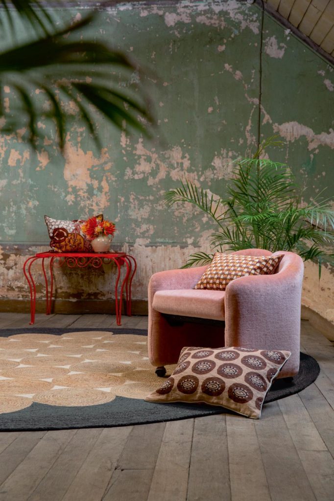 Here, what pleases is the proportion of the colours. The dilapidated wall sets the tone and calls for pink, so why not contrast it with bright red to surprise. The black of the carpet binds the whole with aplomb. With the green of the plants we just feel good.