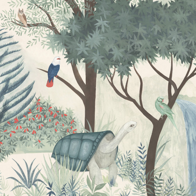 Goodlands, panoramic non-woven panel representing an imaginary landscape of Mauritius with its fauna and flora entirely hand-painted.
