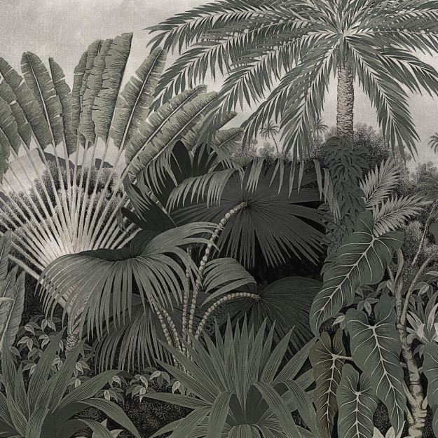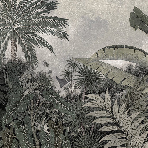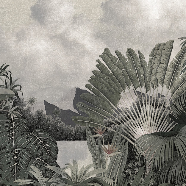 The Itaya Patina panoramic wallpaper is Amazonian luxuriance incarnate. The sky, the mountains and the water of the eponymous Peruvian river are present, but it is above all the exuberant tropical vegetation that captures us. With Itaya, we don’t just look at the landscape, we are literally immersed in it. We can admire the varied and excessive flora up close, presented in a cameo of deep, muted greens. Traveller’s tree, banana trees, monsteras, coconut trees are flourishing in a charged atmosphere. Indeed, the different shades of grey and sepia of the clouds suggest that the storm is not far away. Has it already passed or is it about to fall? In the distance, the mountains catch the eye and open up new horizons. Itaya Patina has a light sepia patina with cracks, which gives it a lot of elegance and refinement.