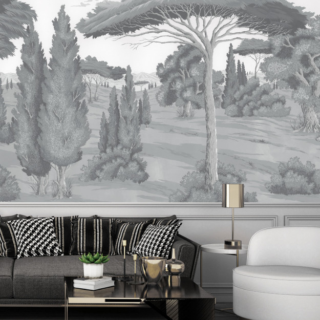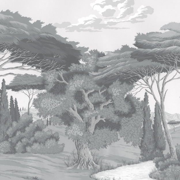 The Sovana Green panoramic wallpaper evokes the song of the cicadas, the arid heat of Tuscany, the old stones and the Mediterranean sun. It is easy to imagine yourself strolling among the umbrella pines, cypresses and oaks, after having lunch in the shade in the courtyard of a charming old building. Presented here in a very soft and peaceful, almost faded green, this Italian landscape done in tempera has a very bucolic feel. Time seems to have stood still. All that remains is to admire the view.