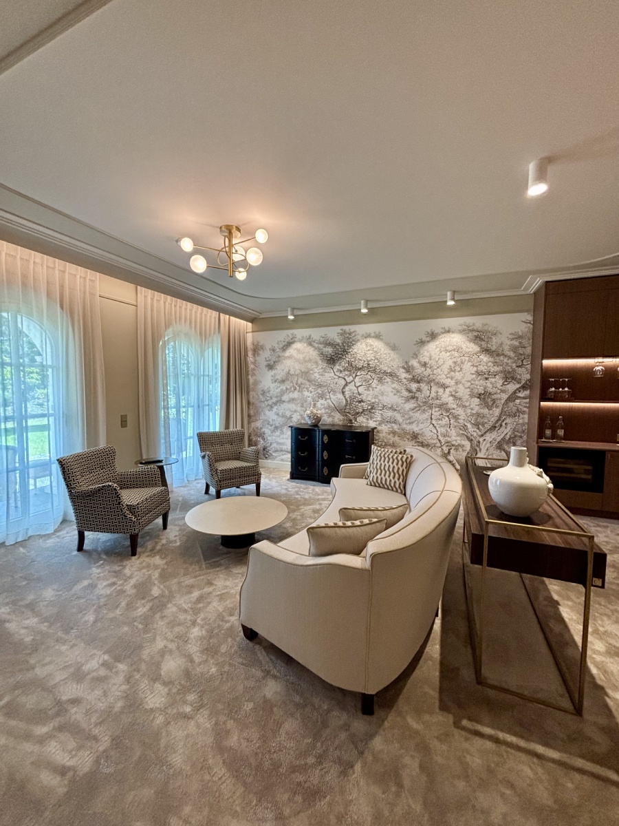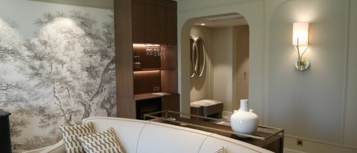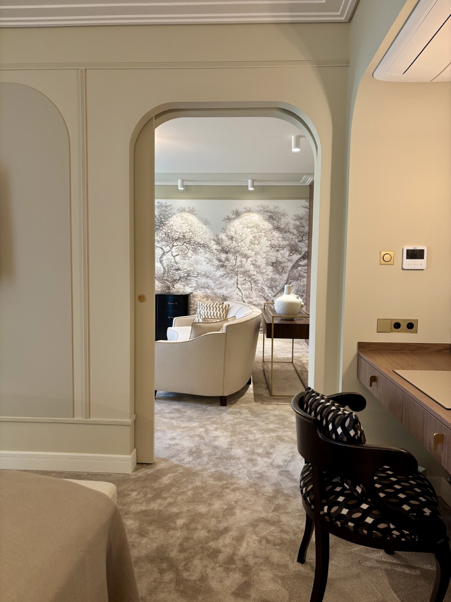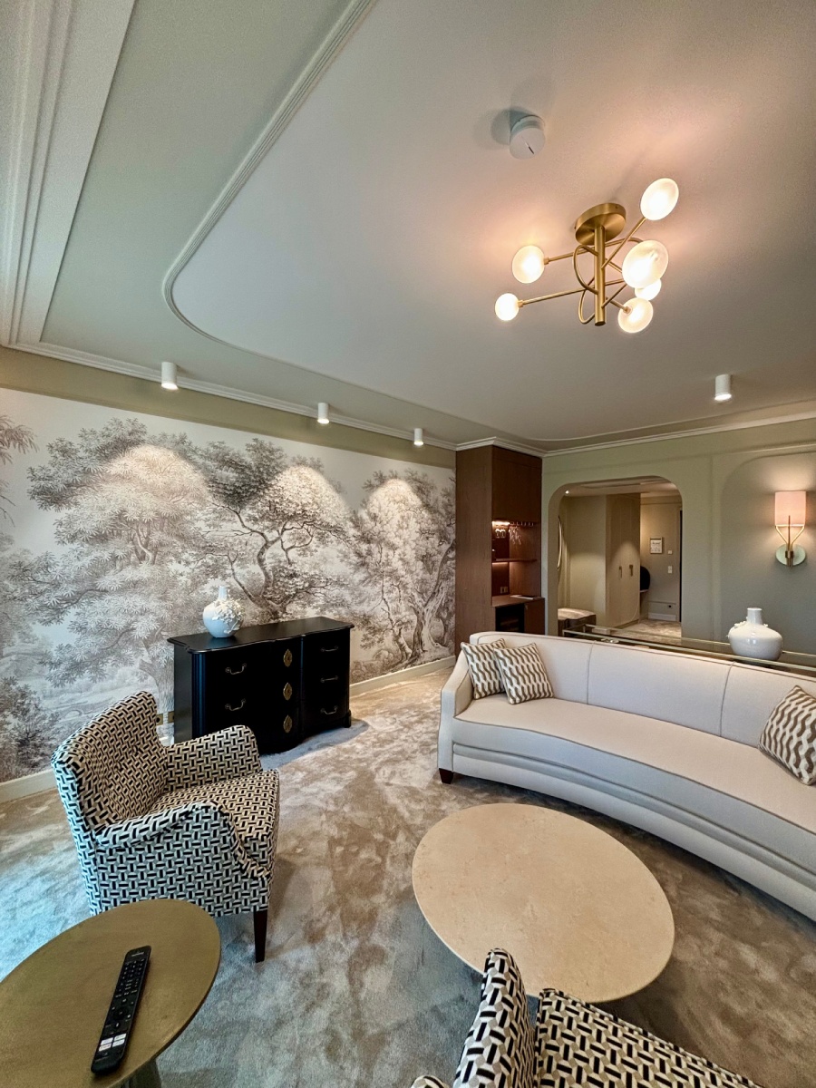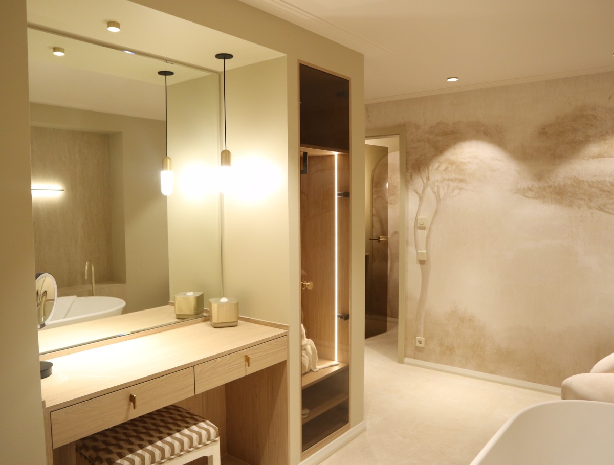 With a forest theme, Vanina Henry designed the 80 m² master suite and its travertine bathroom with luxurious fittings, including a sauna promising ultimate relaxation before a 3-star dinner. The design is luxurious and refined, with neutral tones and materials selected from leading French and Italian fabric and wallpaper manufacturers. With its rounded shapes, the architecture is soft, each line has been carefully considered with generous volumes. The mouldings adorn the walls in a contemporary style, the doors blend subtly into the décor. The furniture has been chosen from high-quality European manufacturers, allowing for exacting customisation.