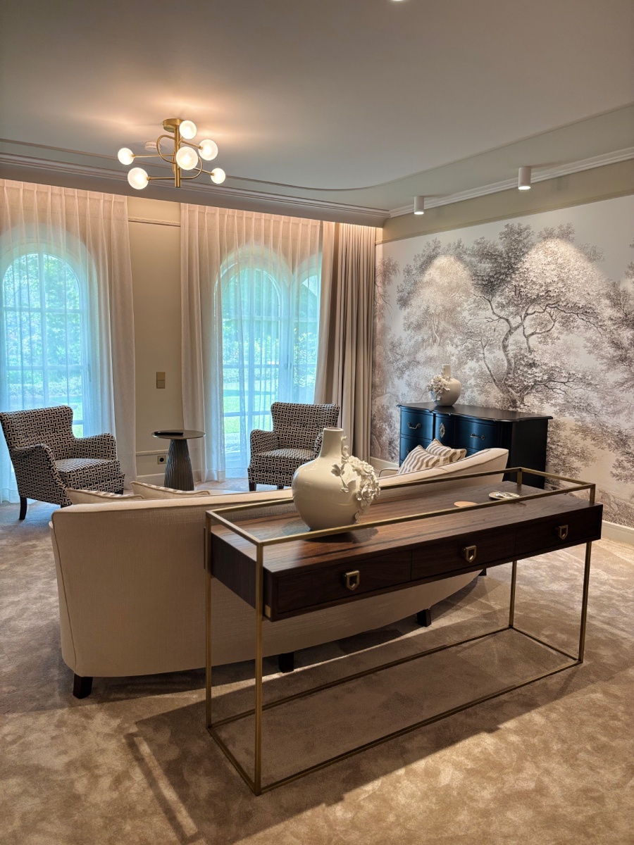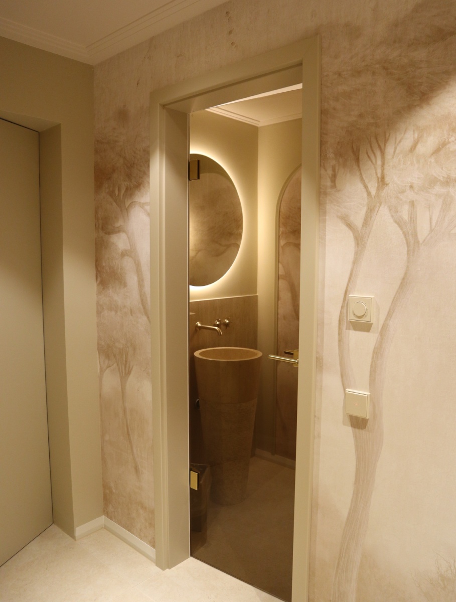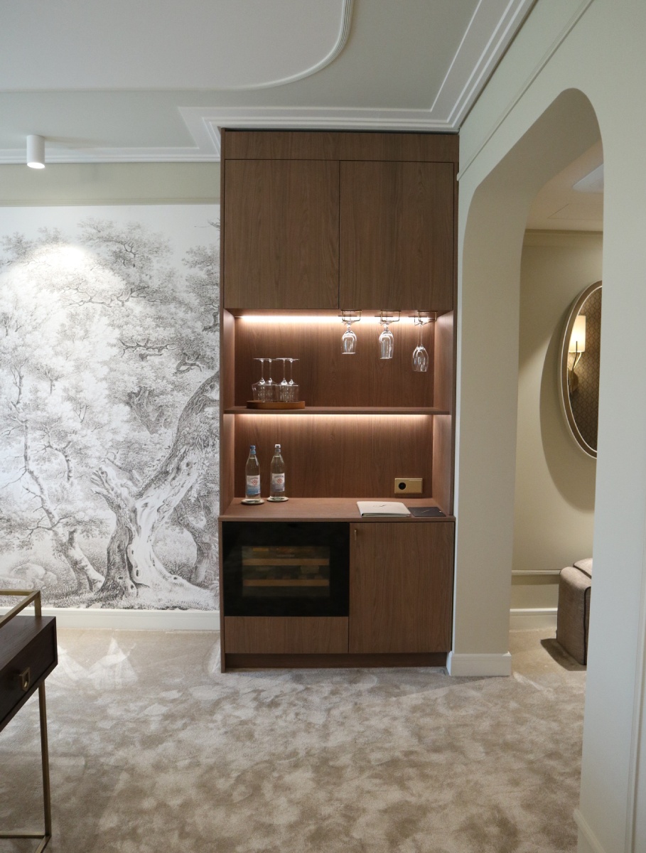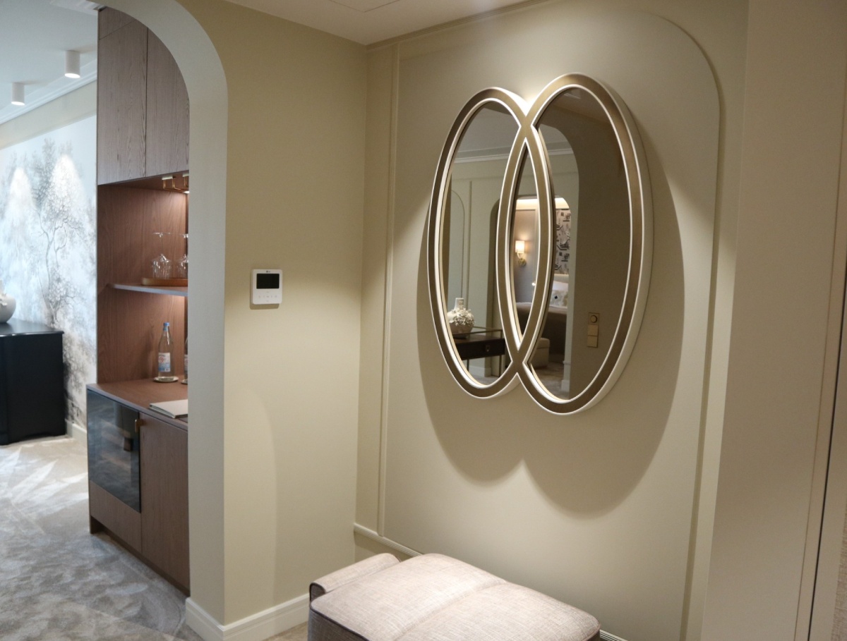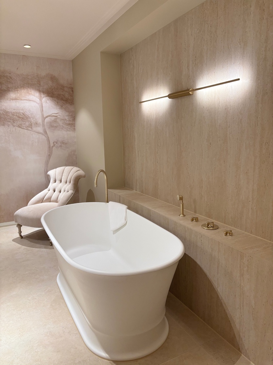 With a forest theme, Vanina Henry designed the 80 m² master suite and its travertine bathroom with luxurious fittings, including a sauna promising ultimate relaxation before a 3-star dinner. The design is luxurious and refined, with neutral tones and materials selected from leading French and Italian fabric and wallpaper manufacturers. With its rounded shapes, the architecture is soft, each line has been carefully considered with generous volumes. The mouldings adorn the walls in a contemporary style, the doors blend subtly into the décor. The furniture has been chosen from high-quality European manufacturers, allowing for exacting customisation.