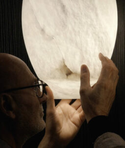 Véritable expert de la pierre et scénographe de la lumière, Atelier Alain Ellouz, est un atelier d’art qui met en valeur les subtilités vibrantes de l’albâtre et du cristal de roche. Ces matériaux sont transformés en luminaires et structures architecturales d’un design minimaliste ornant les plus beaux intérieurs de luxe.