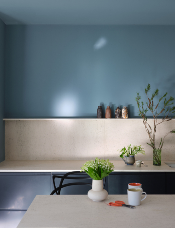 Ce bleu froid et pur rappelle la couleur des ailes oiseaux de mer volant en plein soleil. Kittiwake se situe entre Parma Gray et Lulworth Blue, ; une touche de noir la rend plus chaleureuse et apaisante. Cette teinte est parfaite pour les espaces de vie et reste résolument bleue sous toutes les lumières. Elle se marie également parfaitement à l’inox, si bien qu’elle est magnifique dans les cuisines contemporaines. Ce bleu sophistiqué est mis en valeur par Wine Dark et Borrowed Light.