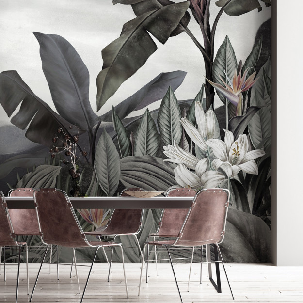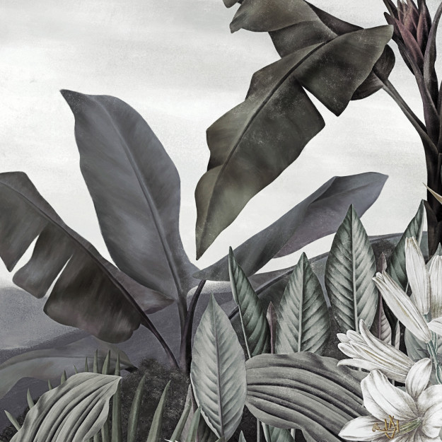 Tara est un voyage magique dans un paradis tropical fantasmé où la nature se voit, et se vit, en très grand format, puisque la végétation sort elle-même du cadre. Ce papier peint panoramique aux couleurs sourdes et passées dominées par le gris et le vert bleuté, met en lumière toute la beauté de la végétation, sa volupté et sa fraîcheur. Parmi les grands feuillages exotiques, des lys blancs et des oiseaux de paradis s’épanouissent. Une perruche a également trouvé refuge dans cet eden. Mais que ce magnifique rideau végétal ne vous empêche pas de regarder au loin. Il s’ouvre ainsi pour offrir une vue dégagée sur les montagnes lointaines et des oiseaux en quête de nouveaux horizons. Ce papier peint est traité avec une légère patine sépia, qui rappelle les papiers peints panoramiques d’antan.