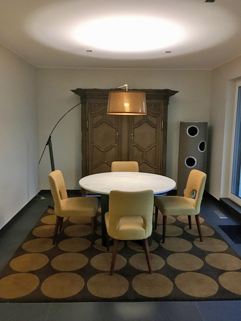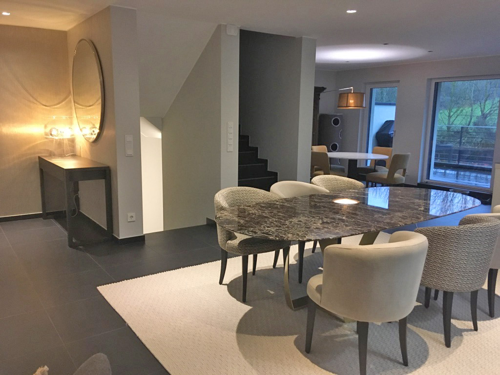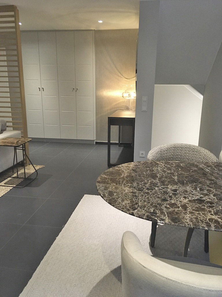 Une table de 2m50 en marbre Dark Emperador de chez Potocco trône au centre de l'espace.