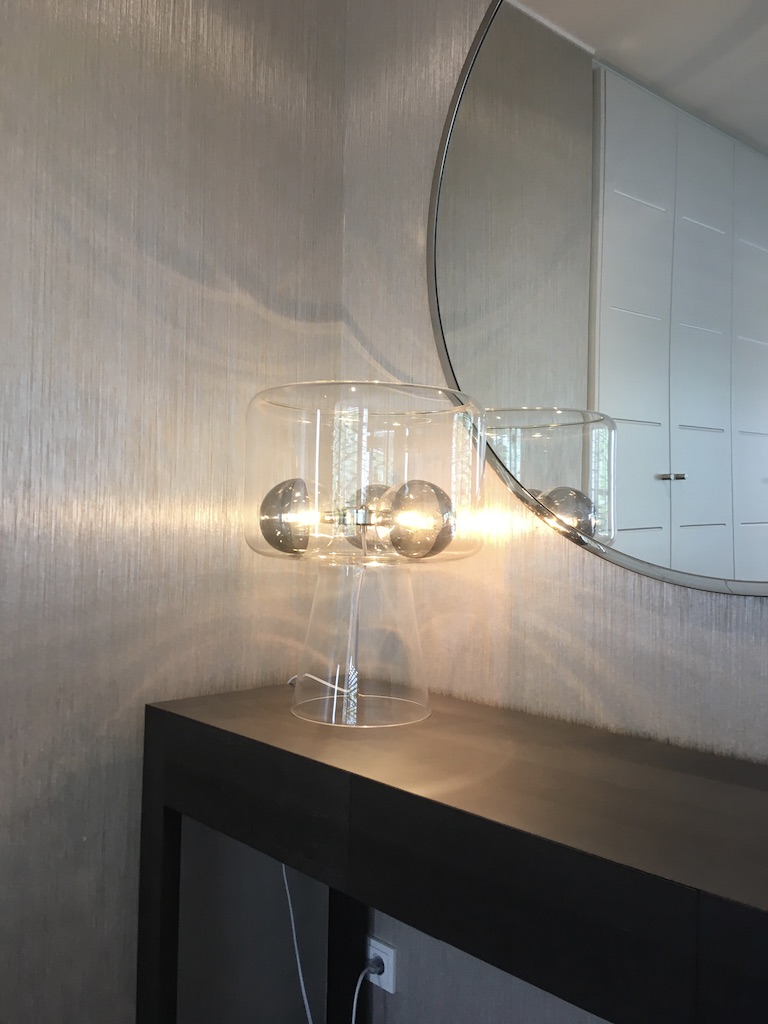 Avec les clients nous avons choisi les tissus des assises et les matériaux ensemble. Les murs ont été repeints avec la peinture Farrow & Ball.